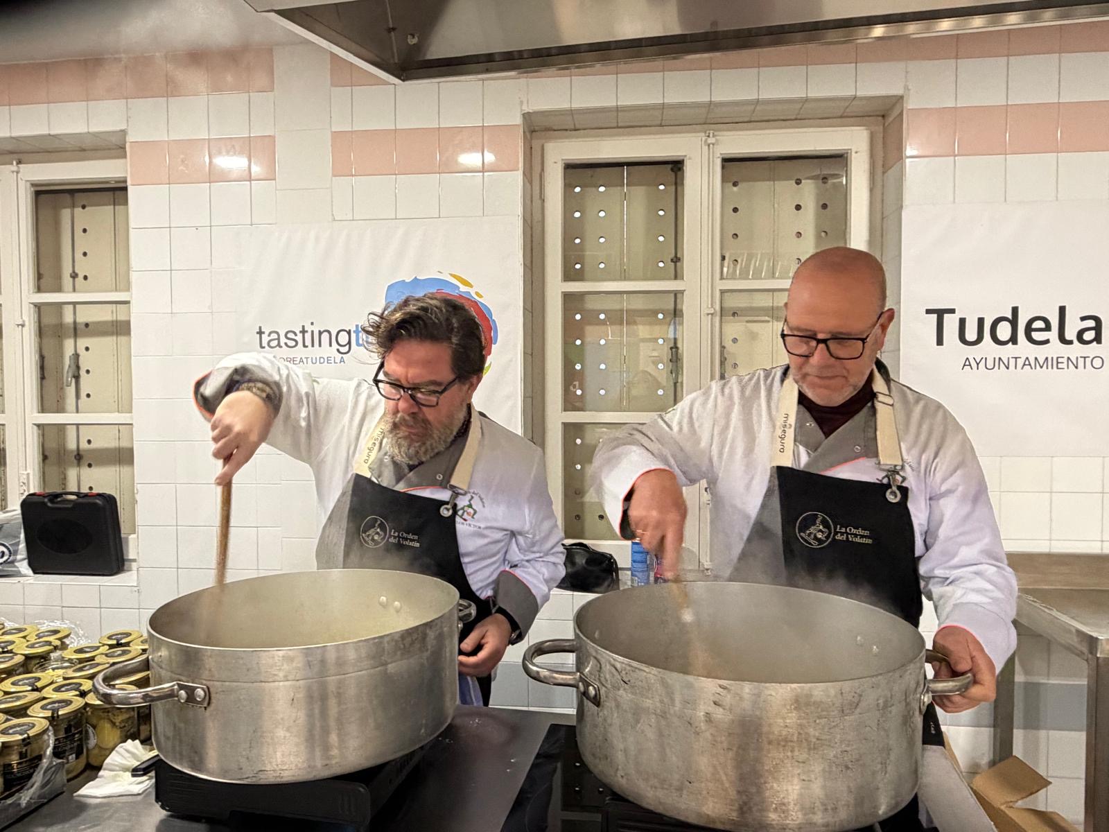 A pesar de la lluviosa mañana, decenas de personas se acercaron al céntrico mercado de abastos de Tudela a disfrutar del guiso que la entidad tudelana elaboró.