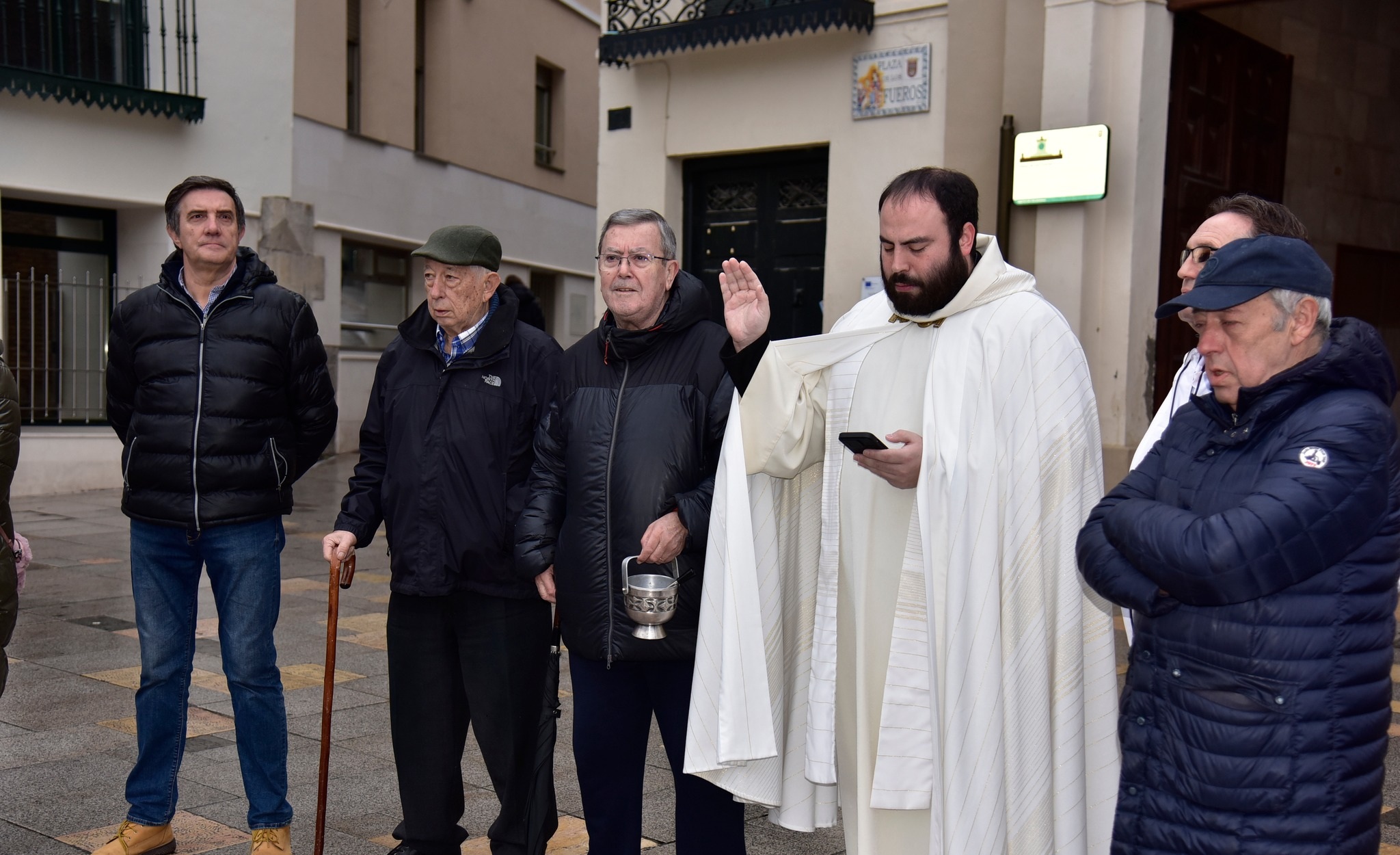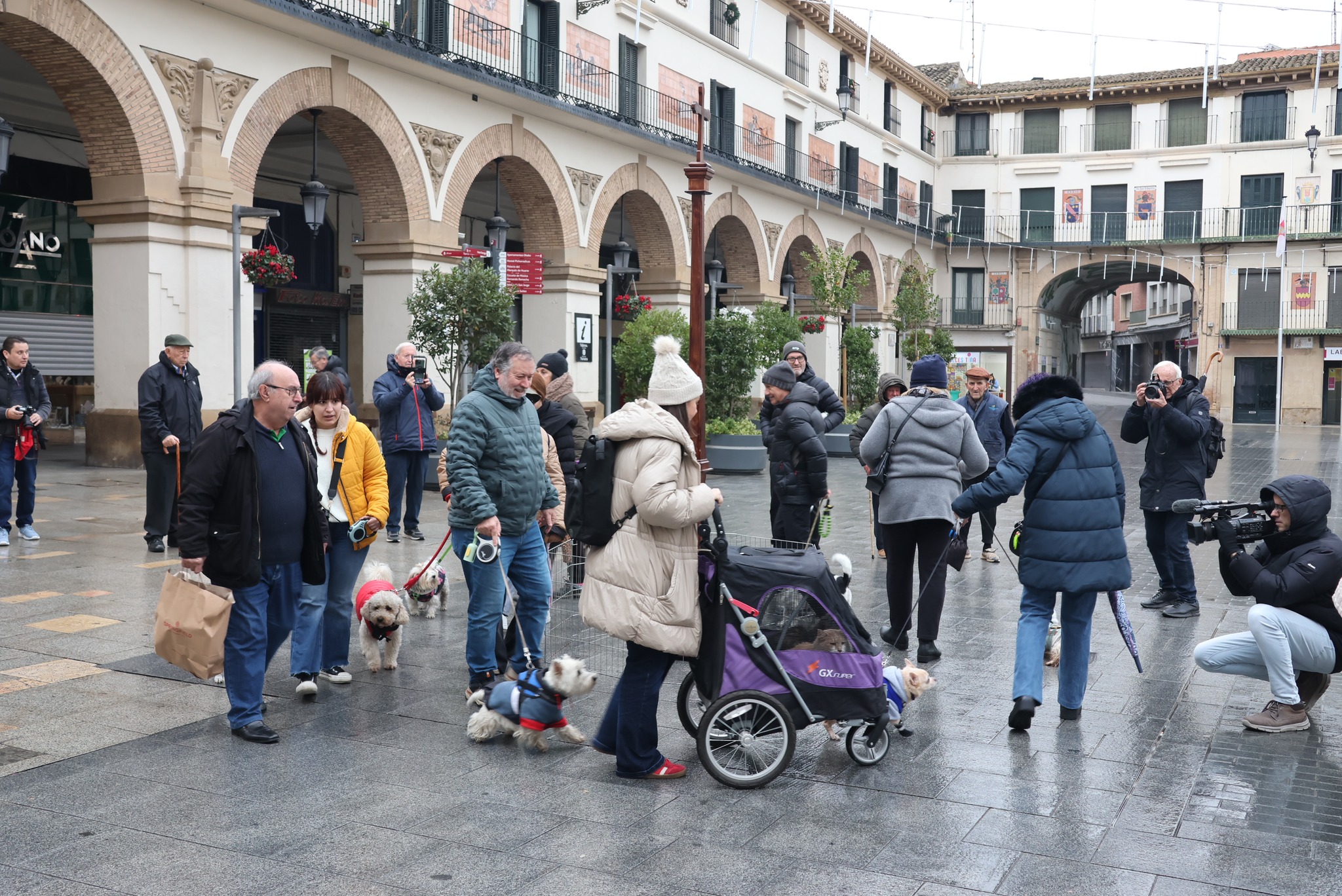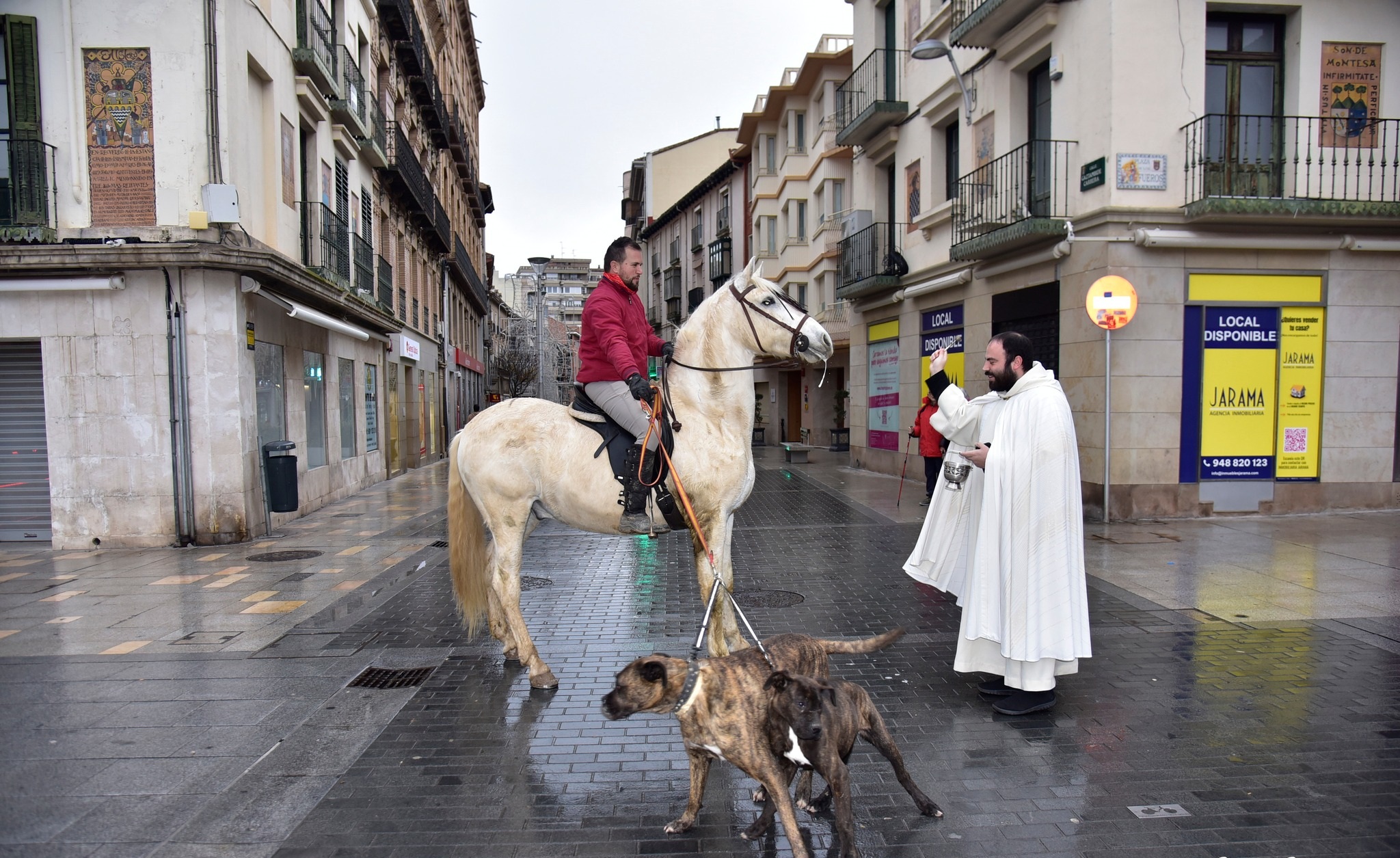 Una tradición que volvió a reunir a numerosas personas junto a sus mascotas desde minutos antes de las 10 de la mañana bajo una lluvia que fue la protagonista de toda la jornada. Todos ellos dieron las protocolarias tres vueltas a la Cruz situada en la plaza Nueva frente a la puerta de la iglesia de Santa María -a 10 metros, como manda la tradición- para recibir la bendición de San Antonio Abad.